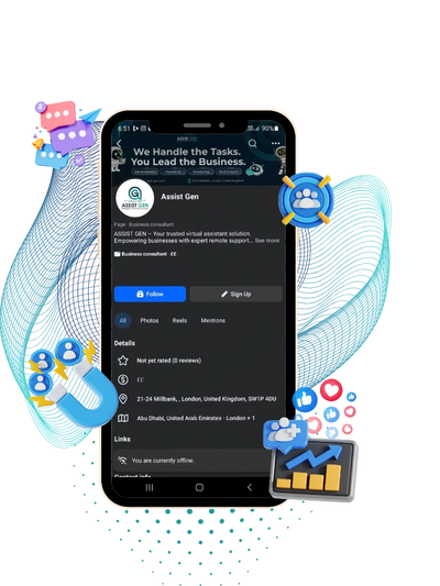 At ASSIST GEN, we help businesses build a strong online presence with our expert Social Media Marketing Support. Our team manages your social media platforms, creates engaging content, schedules posts, and interacts with your audience to ensure consistent brand visibility. We also monitor performance, track analytics, and provide insights to optimise your campaigns, helping UK businesses grow their reach, engage customers, and drive meaningful results—all while saving you time and resources.